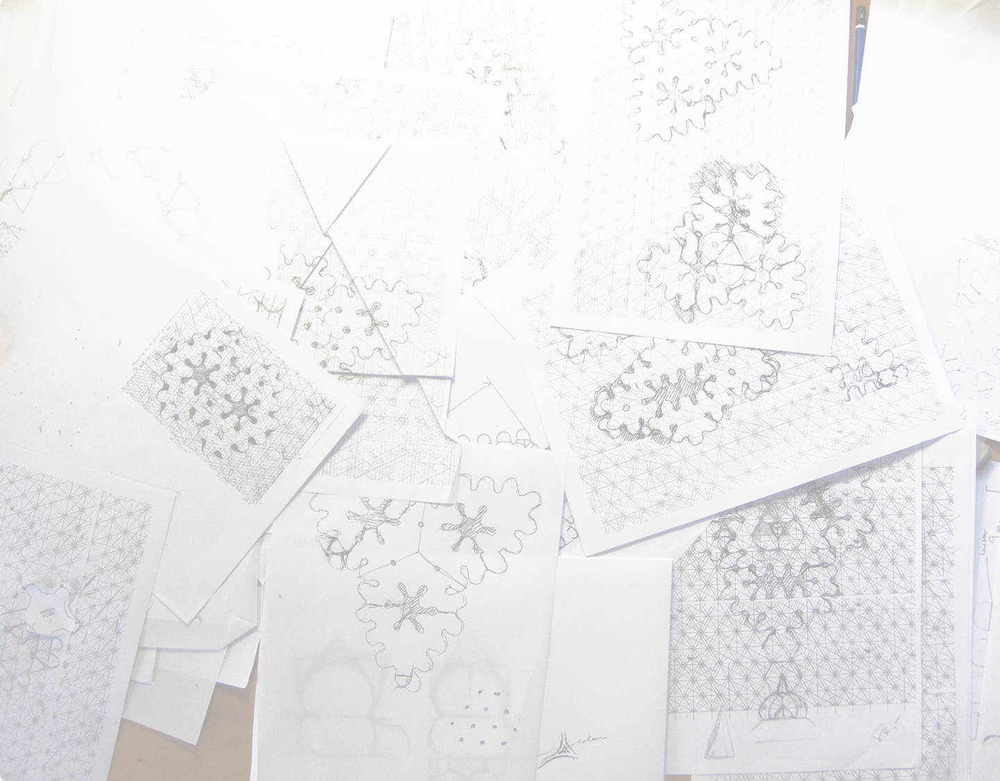 Pentalum is a celebration of the beauty of geometry and, in particular, of the pentagon and its derivatives. The luminaria have long used forms based on the Platonic solid, the dodecahedron, and the variants described by Archimedes. Alan Parkinson favours these forms for their unsettling asymmetry that complements the sense of losing oneself. The outer dodecahedral domes all have a seam motif based on the Schlegel diagram of a flattened dodecahedron, so that these domes become dodecahedrons within pentagons within dodecahedrons. A ‘tree’ occupies the centre space and, in keeping with the theme, the tree is also 5-sided instead of the usual six-sided trees of previous structures. An exception to the theme is the heptagonal Main Dome, which, in order to achieve more volume, has seven sides to sustain the desired asymmetry. This dome continues the research into the rendering of the muqarnas dome-like surfaces that are such a beautiful feature of Islamic architecture.